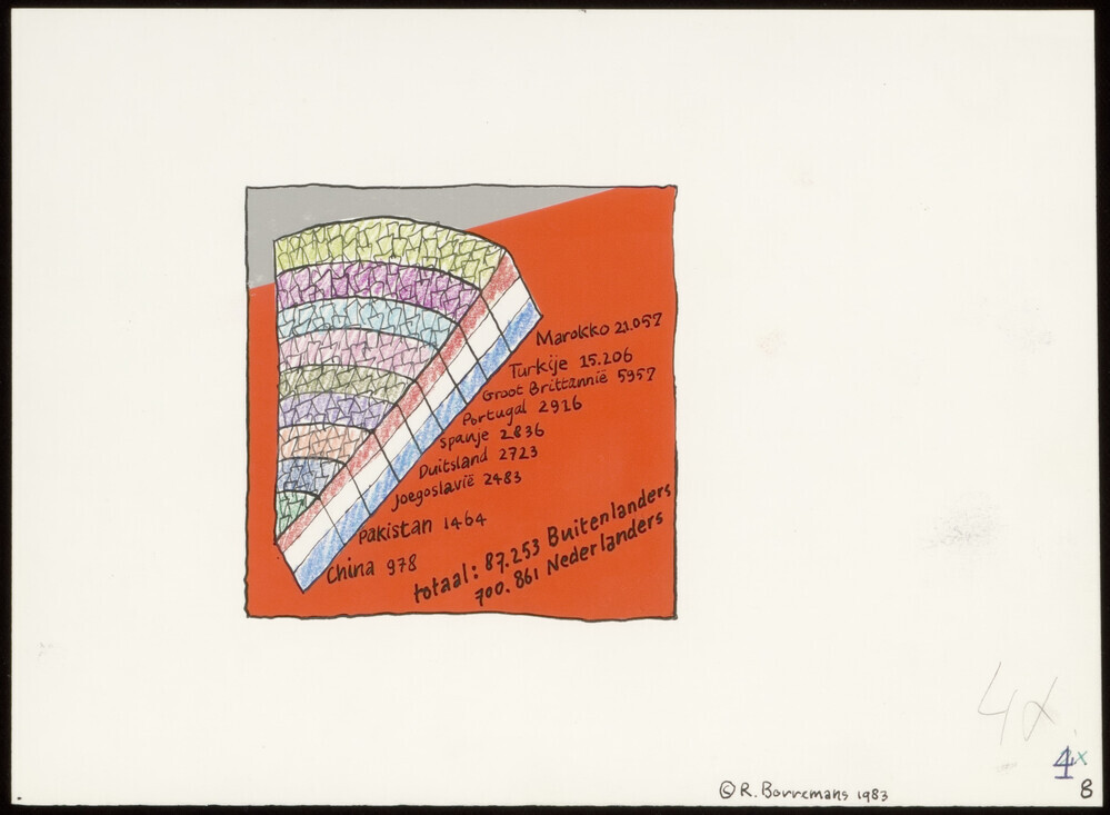 opschrift voorzijde: Marokko 21.057 // Turkije 15.206 // Groot Brittannië 5957 // Portugal 2916 // Spanje 2836 // Duitsland 2723 // Joegoslavië 2483 // Pakistan 1464 // China 978 // totaal: 87.253 Buitenlanders // 700.861 Nederlanders