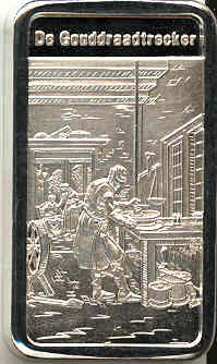 éénzijdige staande rechthoekige penning waarop een gouddraadtrekker in zijn werkkamer staat gegraveerd aan zijn werktafelmet attributen.