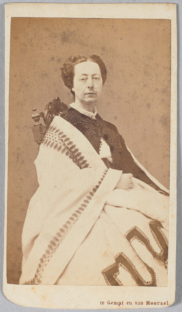 ‘Ik haat alle stijfheid en etiquette, maar ook bemin ik geen familiariteit’, zo omschreef Louisa Holthuysen (1824-1895) haar eigen karakter tijdens een verblijf in Brussel in 1858. Enigszins gereserveerd kijkt ze in de lens van de fotograaf. Louisa was enig kind van Pieter Gerard Holthuysen (1785-1858), schatrijk koopman in Engelse steenkool, en Sandrina Lepeltak (1793-1856). In 1861 trouwde ze met de Amsterdamse kunstverzamelaar Abraham Willet (1825-1888). De foto dateert uit de eerste jaren van haar huwelijk getuige de eigenhandige aantekening "age environ 40 ans" en de jaartallen 1863 en 1864 op de achterkant. Blijkbaar wist ze toen zelf al niet meer wanneer de poseersessie was. Een tweede exemplaar van deze carte de visite, voorzien van het opschrift Tante Willet-Holthuysen, is in bezit van nazaten van Dirk Jacob Willet, de broer van Abraham. ( Bert Vreeken)