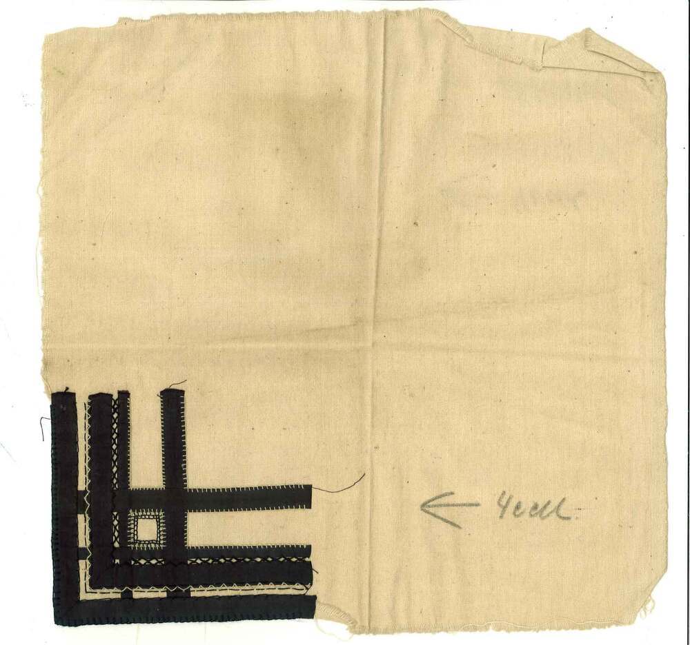 Wit katoenen lamp met daarop, in hoek linksonder, zwart band genaaid met siersteken. Ter rechterzijde in potlood pijl met tekst geschreven: 4 cm.