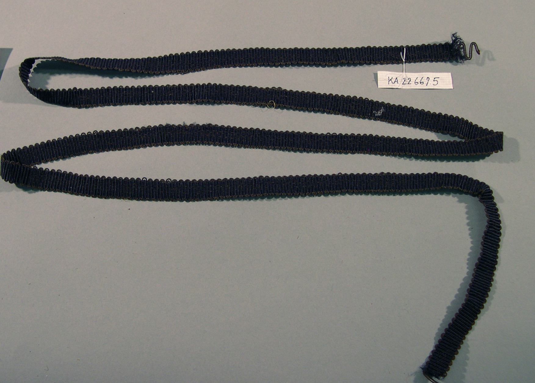 Passement geweven van blauwe katoen en wol. De inslag heeft de vorm bepaald.- Trefwoorden