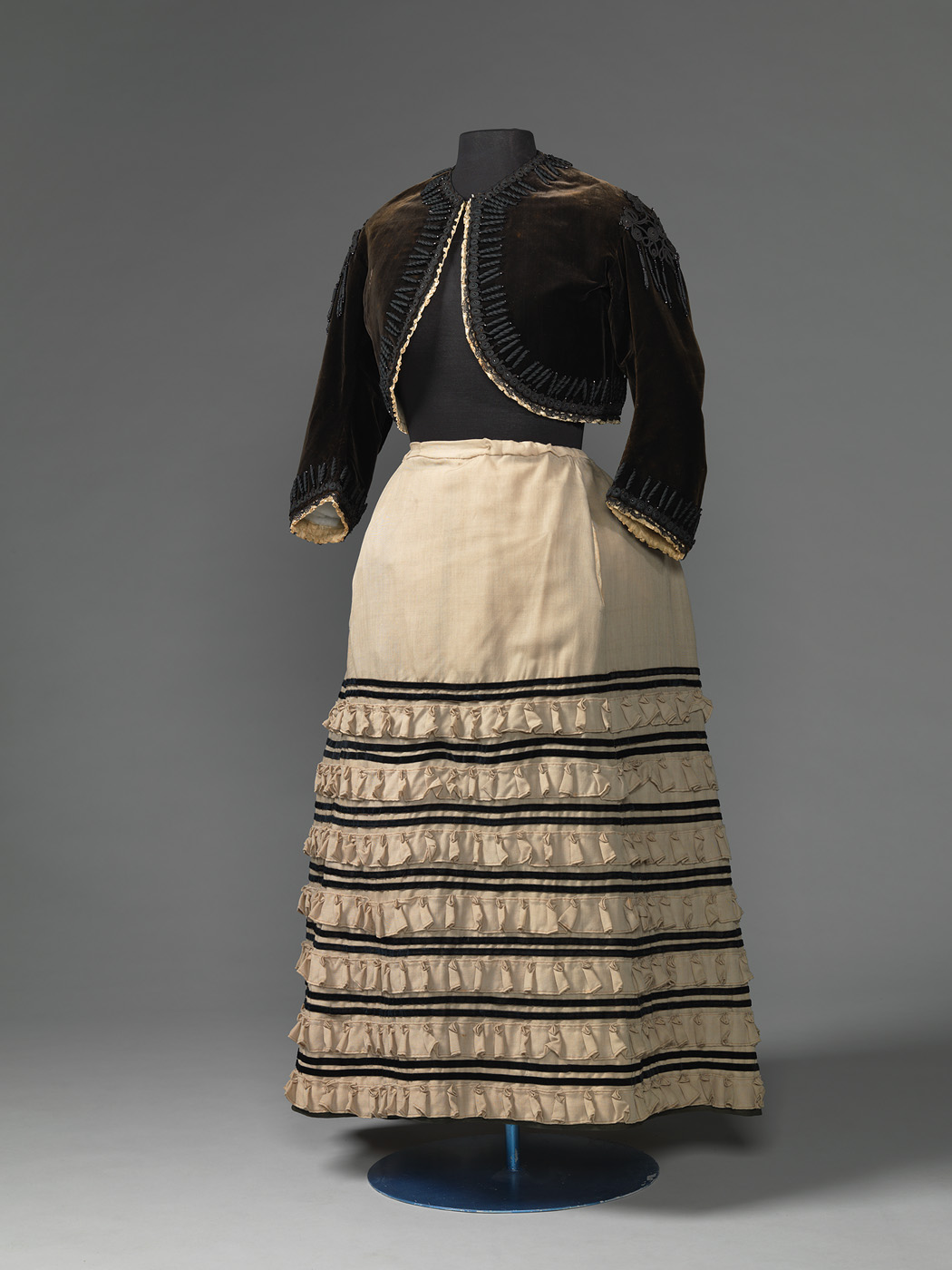 De pelerine is vroeger gemaakt dan de rok en bolero. Door de kleur, de zwarte harde zijde, de fluwelen band en het model is de pelerine te dateren tussen 1845-1850.