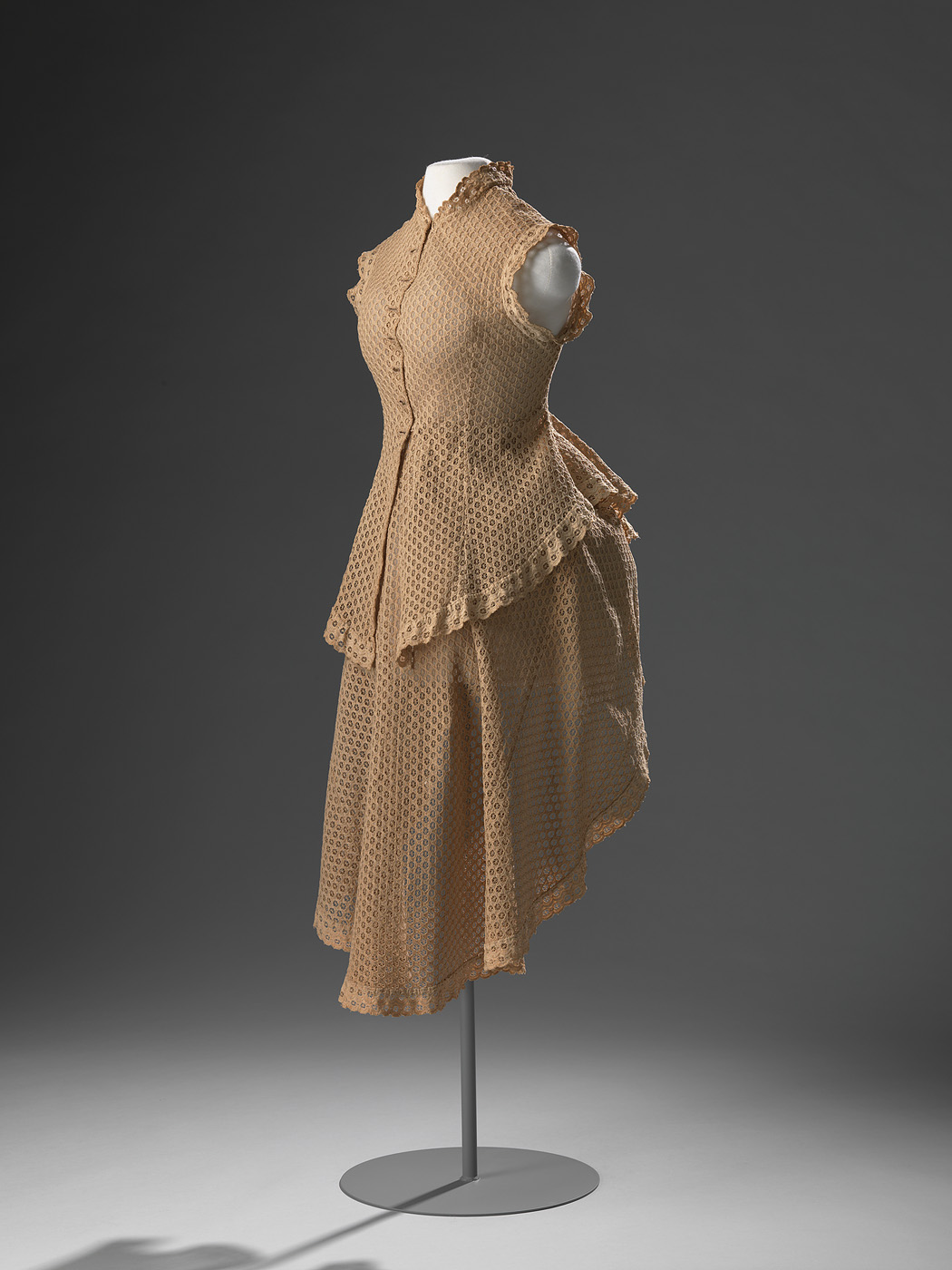 Mouwloos lijfje van crème linnen bandstof. Het lijfje had oorspronkelijk mouwen. Het lijfje heeft een ronde lijn aan de onderzijde van de voorkant. Aan de achterzijde is ruimte voor een queu. Dit maakt dat het lijfje in de mode rond 1870-1875 past.