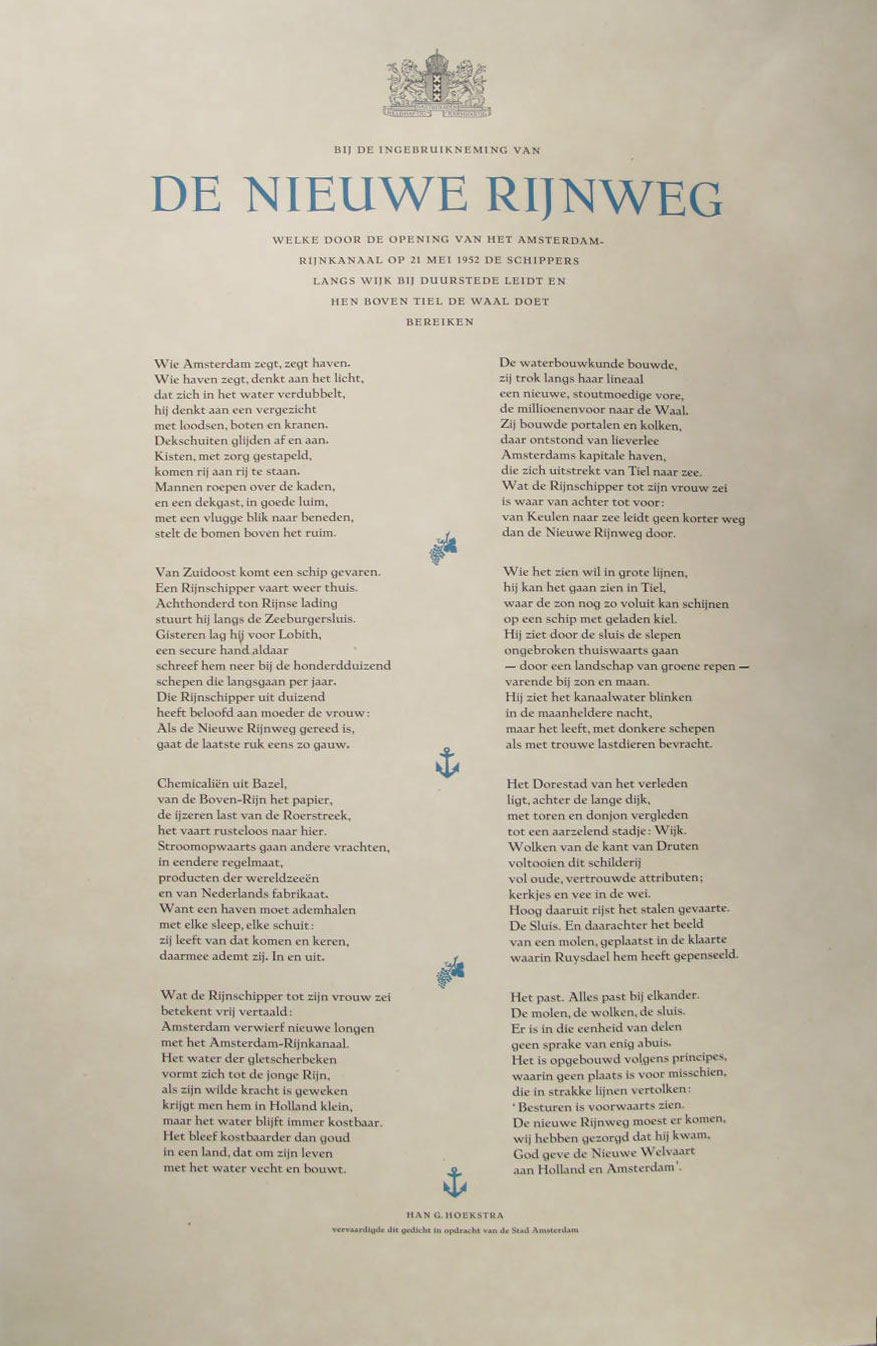 - Gedicht bij de ingebruikneming van de nieuwe Rijnweg (in opdracht van de stad Amsterdam), 1952