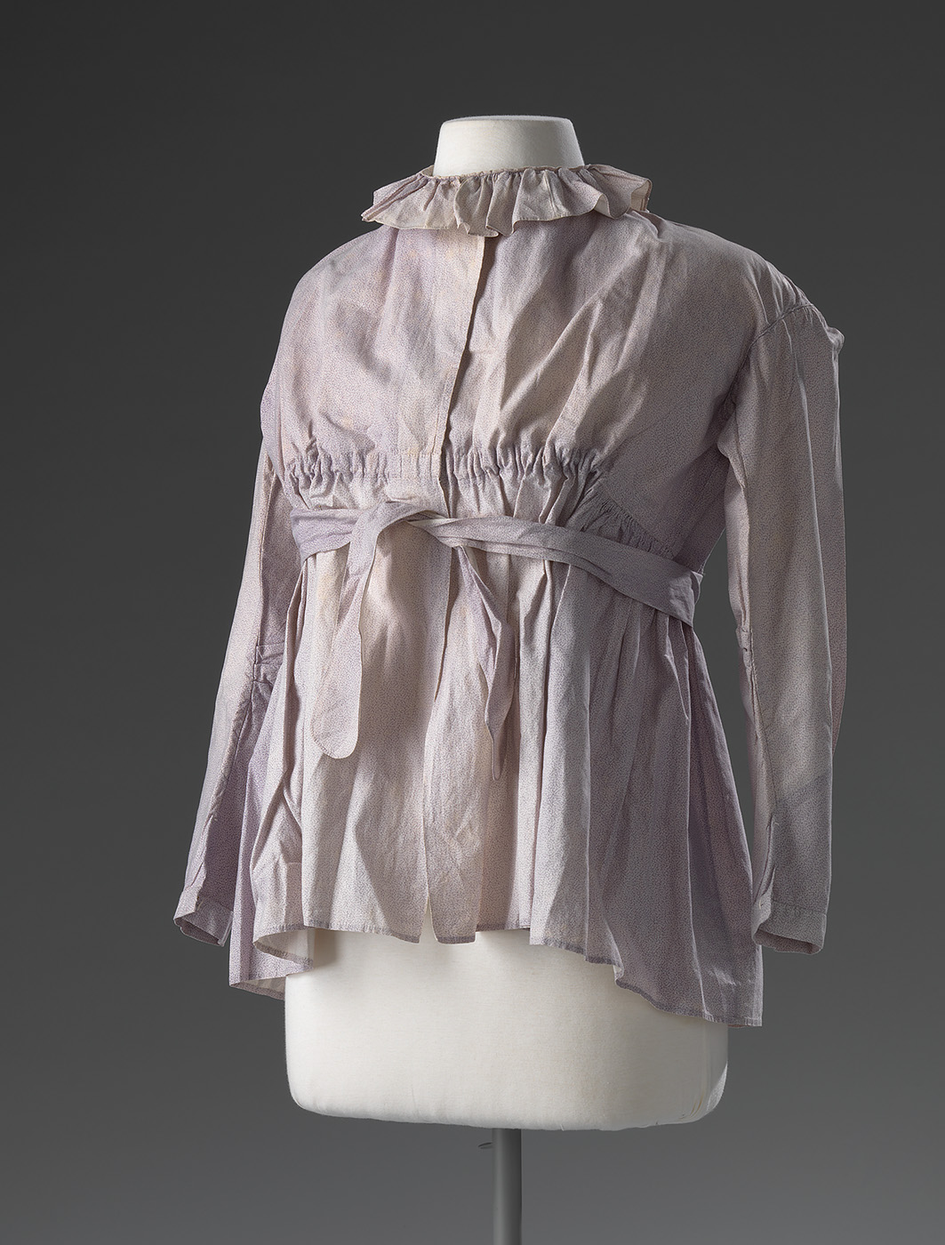 Jak van fijn gespikkelde lila katoen, geplooide kraag, lange mouwen, ceintuur en een lange schoot. Het jak is niet modieus, het is werkkleding voor een vrouw uit de middenstandsklasse. De stof was populair voor werkkleding. Het jak is voor een persoon met een grote maat. Door de lange strakke mouwen, de hoge taille en kraag is het jak tussen 1820-1830 te dateren. Het jak heeft een witte katoenen voering. Dit duidt ook op werkkleding. Nachtkleding werd niet gevoerd.