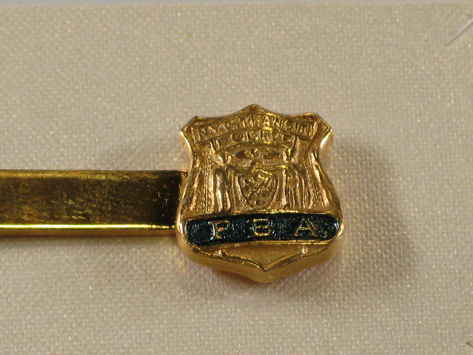 Koperen dasspeld met vignet van New York City Transit Police en daarop afkorting P B A (= Police Benevolent Association).- Trefwoorden