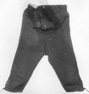 Zwarte zijdeachtig stof, kort pijpen met knopen en gespsluiting (gespen ontbreken) klep van voren, achter rijgbandjes.- Trefwoorden