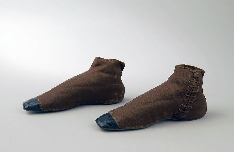 Bruin serge laarsje, lakleer neus, sluiting aan de binnenzij, zonder hak, links en rechts.- Trefwoorden
