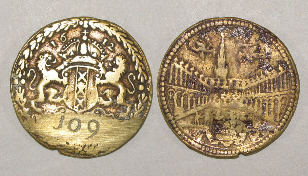 voorzijde: gekroond wapenschild van Amsterdam, geflankeerd door twee leeuwen onder het jaartal 1612; onder de afsnede een nummer. De rand is voorzien van een palmkrans.