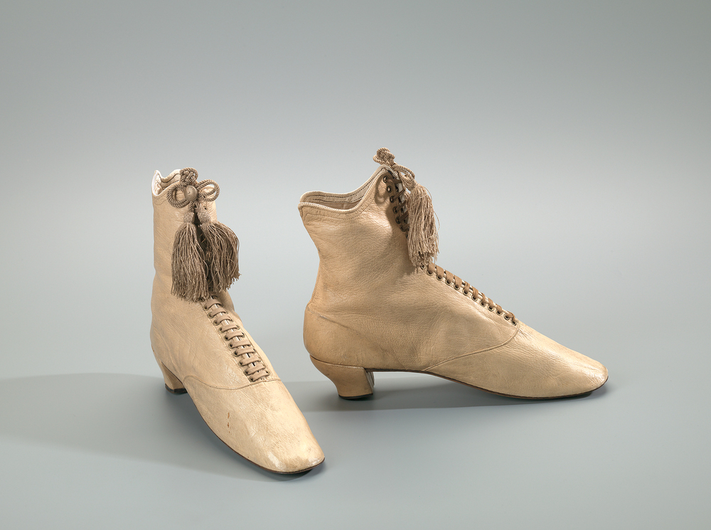 Rijglaarzen van beige glacé leer. Enkelhoog model met taps toelopende neus en hak. De bovenrand is geschulpt en doorgestikt met beige draad. Aan de bovenkant zijn twee beige zijden kwastjes en een met beige zijdedraad beklede sierknoop geplaatst. Sluit middenvoor met een rijgsluiting met metalen oogjes en een veter De leest loopt enigzins krom. De zool is van bruin leer en de hak bekleed met beige glacé leer. De voering is van beige katoen.