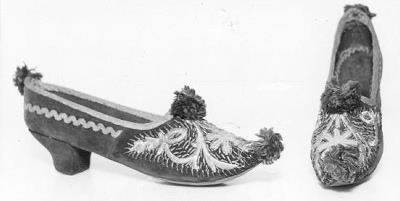 Paar schoenen van blauw fluweel met goud en kralen borduursel, pompons op de neus en hak, opstaande puntneus, hakje, geen links en rechts. Het borduursel is handwerk. De schoen is niet-Europees en was geen onderdeel van de Europese mode. De schoenen werden in huis gedragen. Waarschijnlijk zijn de schoenen op reis meegenomen als souvenir.- Trefwoorden