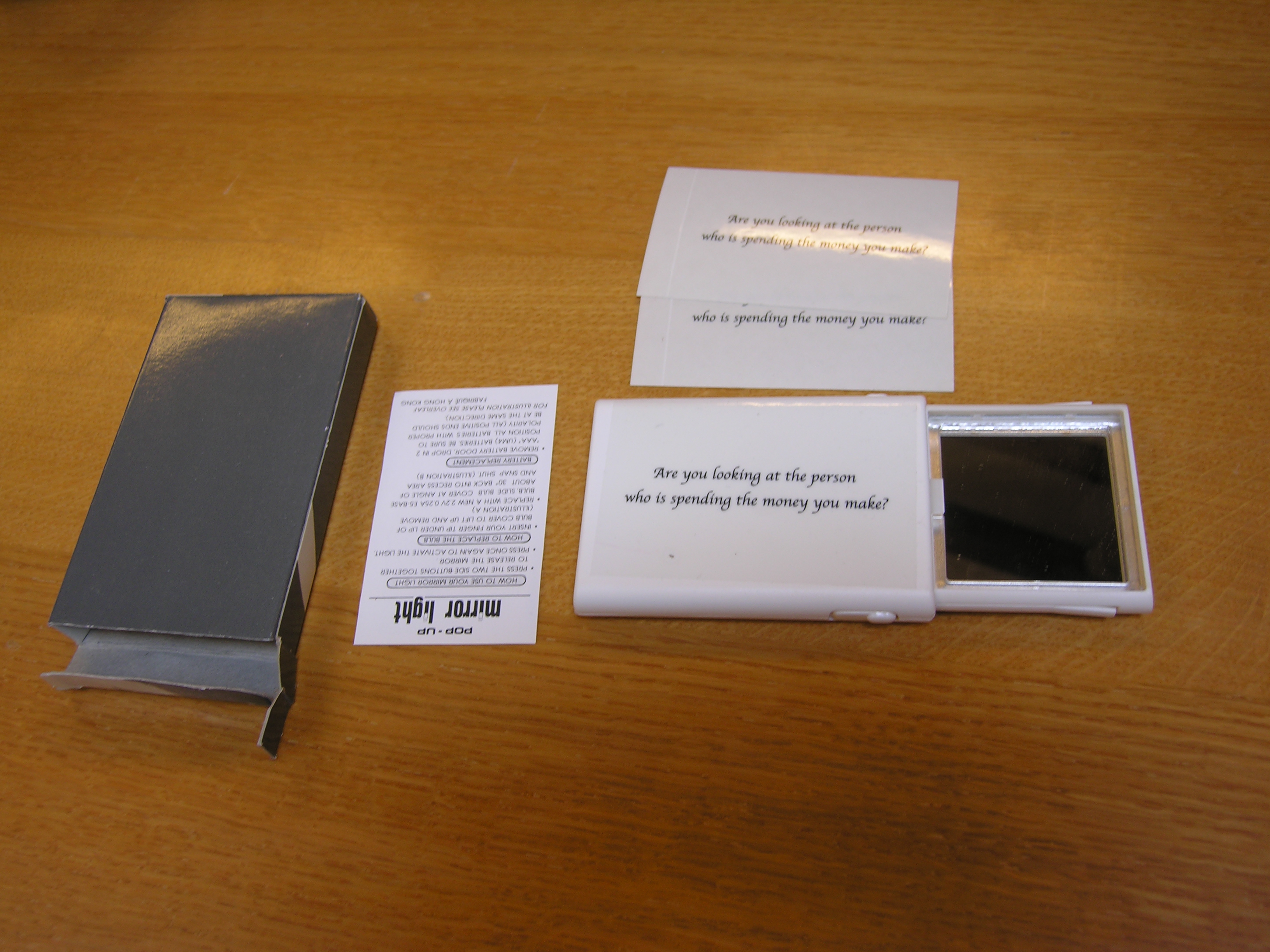 Zakspiegeltje met sticker, in kartonnen doosje. Tekst op sticker: Are you looking at the person/ who is spending the money you make?/.- Trefwoorden