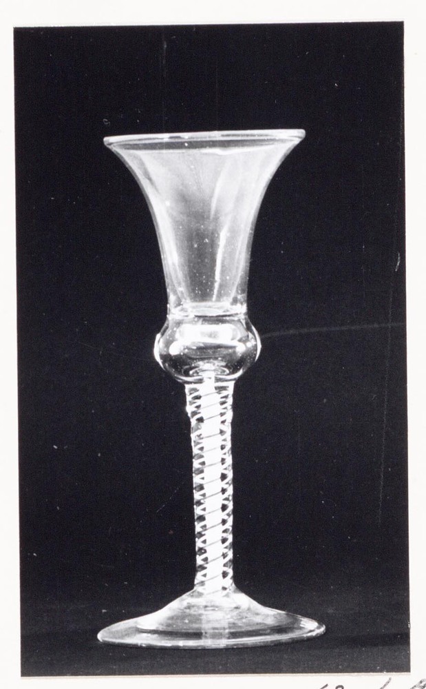 Helder kleurloos glas, opaak wit en rood glas. Conische voet. Stam met alternerend twee witte en twee rode spiralen rond witte netwerkspiraal. Klokvormige kelk met verdikte basis.- Trefwoorden