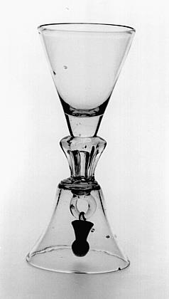 Voormalige collectie Museum Het Broekerhuis te Amsterdam. Op foto P. Oosterhuis het vijfde glas van rechts. De drinker moest proberen het glas in één teug te ledigen zonder de klepel te laten klingelen. ( Bert Vreeken)