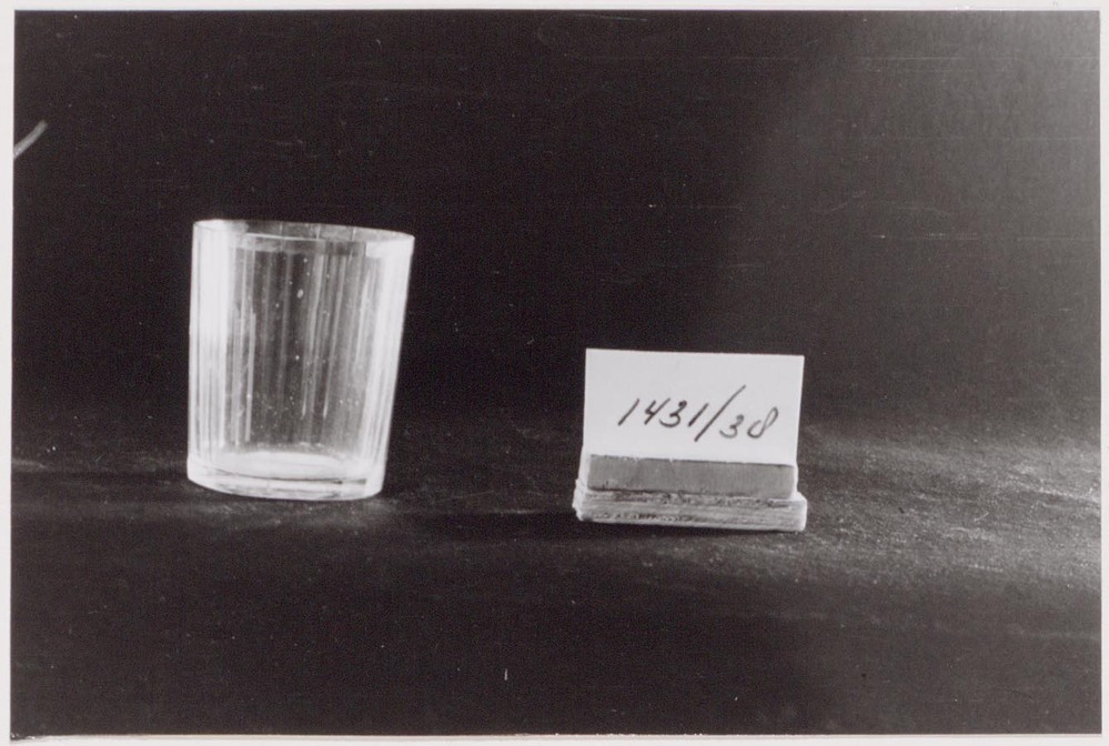Helder kleurloos glas. Vlakke bodem. Cilindrisch, meerkantig gefacetteerd lichaam. Vergulde band onder mondrand.- Trefwoorden