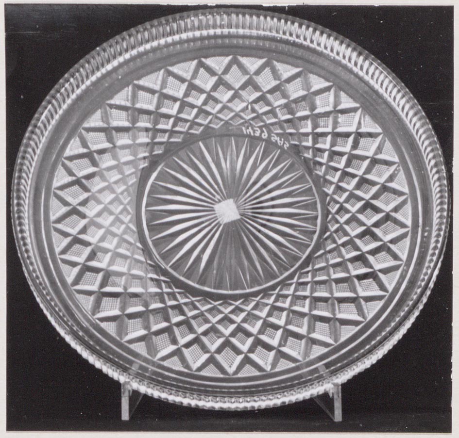 Helder kleurloos glas. Rond blad met opstaande rand, de onderzijde in ruiten, het midden in stervorm geslepen.- Trefwoorden