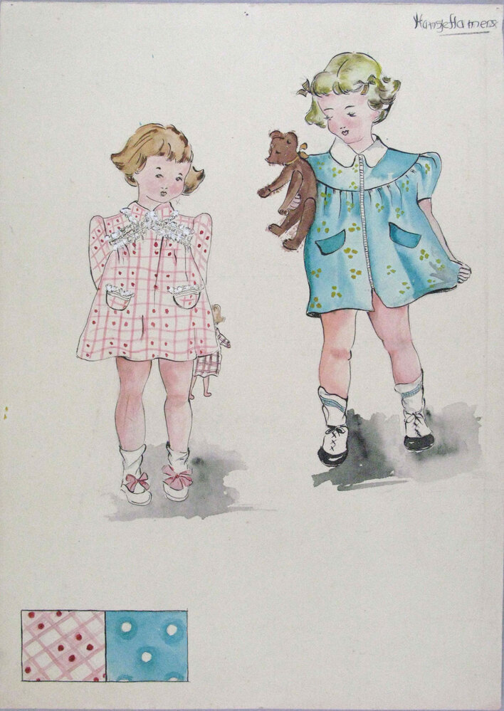 Meisje in roze geruit jurkje en een meisje in turqoise jurkje met groen stippenmotief. Linksonder twee vakjes met ontwerp bedrukking stof van jurkjes.- Trefwoorden