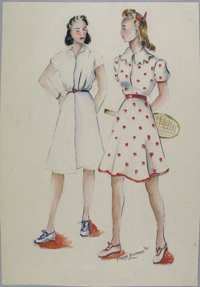 Meisje in witte jurk met smalle rode ceintuur en meisje met tennisracket, in witte jurk met rode noppen, met iets bredere rode ceintuur en brede kraag.- Trefwoorden