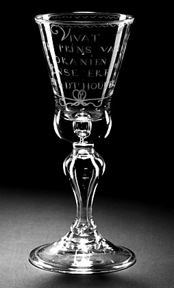 Helder kleurloos grijs getint glas. Conische voet met omgeslagen rand. Holle balusterstam. Klokvormige kelk met verdikte basis en luchtbel. Op kelk het opschrift: VIVAT/ DE PRINS VAN/ ORANIEN/ ONSE ERF/ STADTHOUDER/ en twee gestrikte takken met oranjeappeltjes. Bies met geometrische motieven onder mondrand.