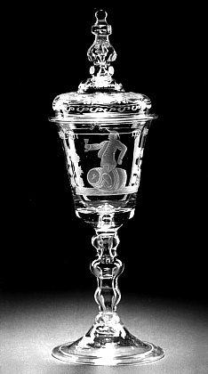 Helder kleurloos glas. Conische voet met omgeslagen rand. Holle stam met drie knopen. Conische, licht uitbuigende kelk met afgeronde, verdikte basis en luchtbel. Op kelk een mannetje met een glas, zittend op een wijnvat. Aan weerszijden druivenranken. Hierboven het opschrift: HANSIE IN DE KELDER/. Dubbel gewelfd deksel met samengestelde knop en langgerekte luchtbel. Deksel en knop in facetten en olijven geslepen.