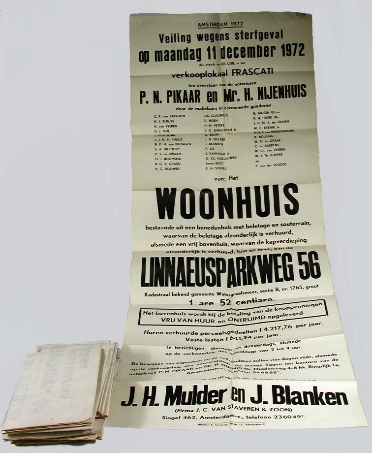 Affiches voor openbare verkoop van onroerend goed, 1971 - 2000 Amsterdam papier hoogte: 128 cm; breedte: 52 cm; schenking 2004-08-30 inv.nr. A 55412.9 in depot