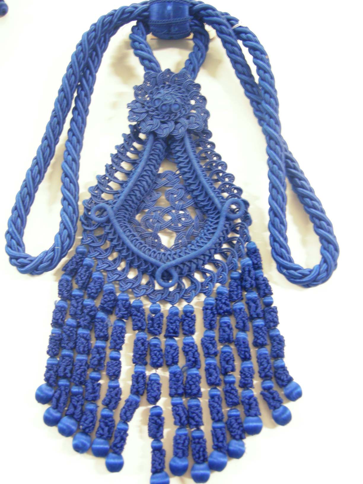 Donkerblauw gordijnkoord, 'druppelvormig' met aan de onderkant franjes.- Trefwoorden
