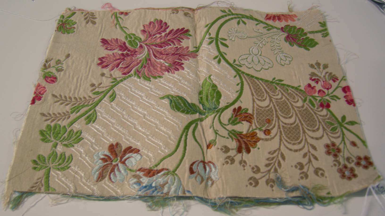 Fragment bekledingsstof. Creme-kleurig, met ingeweven bloempatronen, in groen, roze, bruintinten en blauw. Nieuwe bekleding van de haardfauteuils in de zaal van museum Willet Holthuijsen.- Trefwoorden