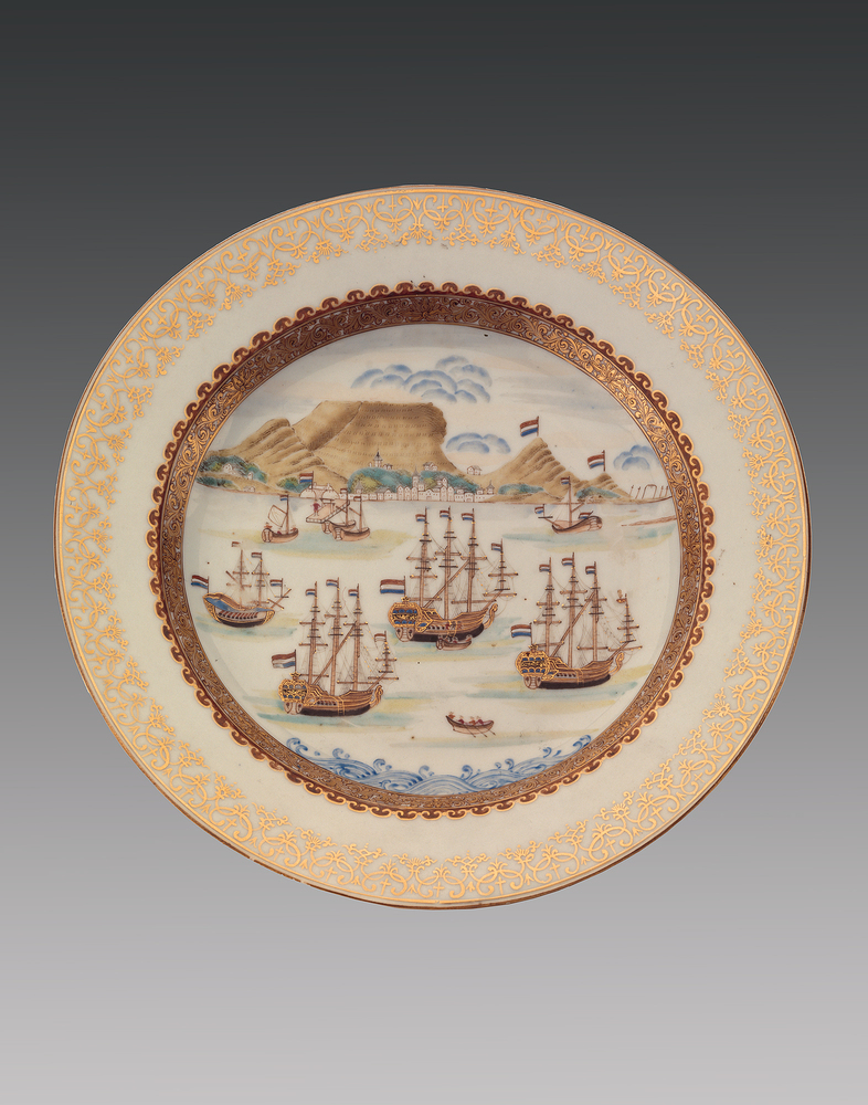 - Bord met afbeelding van VOC-schepen op de rede van Kaapstad, 1736 - 1795
