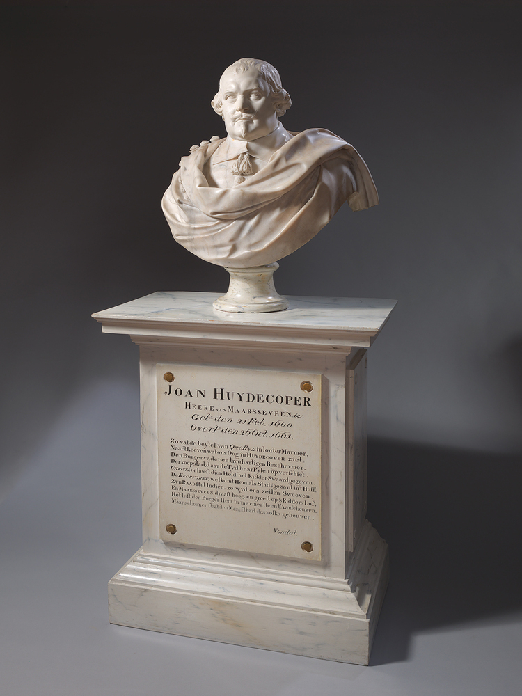 opschrift op voorzijde sokkel: JOAN HUYDECOPER. / HEERE VAN MAARSEVEEN.&. / Gebn den 21 Feb. 1600. / Overln den 26 Oct. 1661. / Zo vat de beytel van Quellyn in louter Marmer, / Naar 't Leeven wat ons Oog in HUYDECOPER ziet. / Den Burger-vader en trouhartigen Beschermer, / Der koopstad, daar de Tyd haar Pylen op verschiet, / CHRISTINA heeft dien Held het Ridder-Swaard gegeven, / De KEURVORST, welkomt Hem als Stadsgezant in 't Hoff,, / Zyn RAAD stut Indien, zo wyd ons zeilen Sweeven, / En MAARSSEVEEN draaft hoog, en groeit op 's Ridders Lof, / Het lust den Burger Hem in marmer-steen 't Aanschouwen, / Maar schooner staat den Man in 't hart des volks gehouwen. / Vondel.