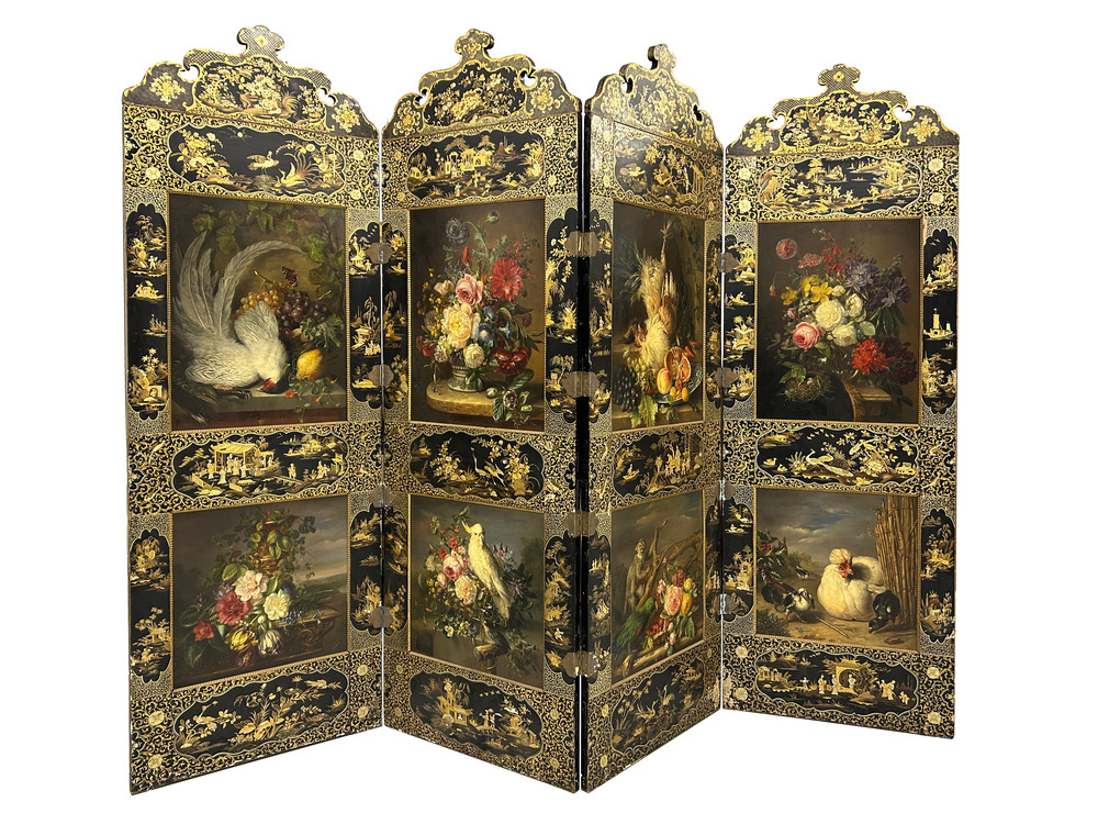 Vierslags kamerscherm, 1854 - 1855 Amsterdam, Amsterdam populierenhout, messing, textiel hoogte: 215.5 cm; breedte: 171 cm; breedte: 71 cm; dikte: 3.5 cm; hoogte: 69.5 cm; breedte: 53.5 cm; hoogte: 53.5 cm; breedte: 53.5 cm; telmerken bovenregel linkerslag en onderzijde bijbehorend kuifstuk: I