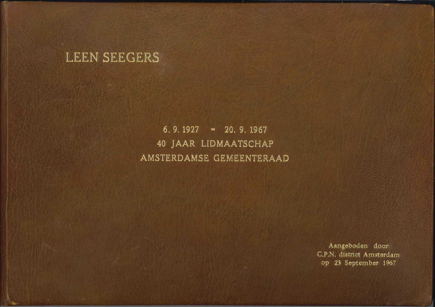 titel voorzijde band: LEEN SEEGERS/ / 6. 9. 1927 - 20. 9. 1967/ 40 JAAR LIDMAATSCHAP/ AMSTERDAMSE GEMEENTERAAD/ / Aangeboden door:/ C.P.N. district Amsterdam/ op 23 September 1967