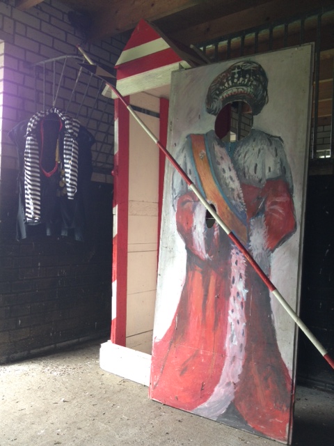 Houten plaat met afbeelding van Beatrix. Twee uitsparingen voor gezicht en hand. (Degene die achter het paneel staat en uitsparing gezicht vult, houdt lans vast.)