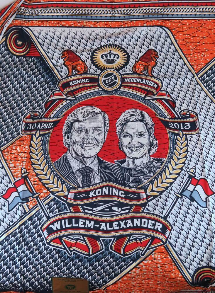 Deze katoenen herinneringsdoek is in een oplage van 2000 stuks vervaardigd ter gelegenheid van de inhuldiging van koning Willem-Alexander en koningin Máxima op 30 april 2013. Het eerste gedeelte van de inhuldiging, waarbij koningin Beatrix de akte van abdicatie ondertekende en de titels op Willem-Alexander overgingen, vond plaats in het Paleis op de Dam. Voor het tweede gedeelte, de daadwerkelijke inhuldiging tijdens een Verenigde Vergadering der Staten-Generaal, verplaatste het gezelschap naar de Nieuwe Kerk. Op de herinneringsdoek staat een gezamenlijk portret van het vorstenpaar centraal. Om hen heen bevinden zich een lauwerkrans en banderollen met de datum van de inhuldiging, en de titel en namen van de nieuwe koning en koningin. Het geheel is ingezet in een achtergrond van vrolijke patronen in blauw, oranje, rood en wit. ( Sarah Remmerts de Vries)