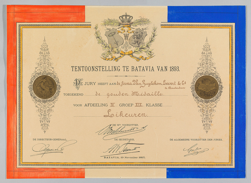 - Document t.g.v. uitreiking gouden medaille aan Van Zuylekom/Levert & Co. in Batavia, 1893