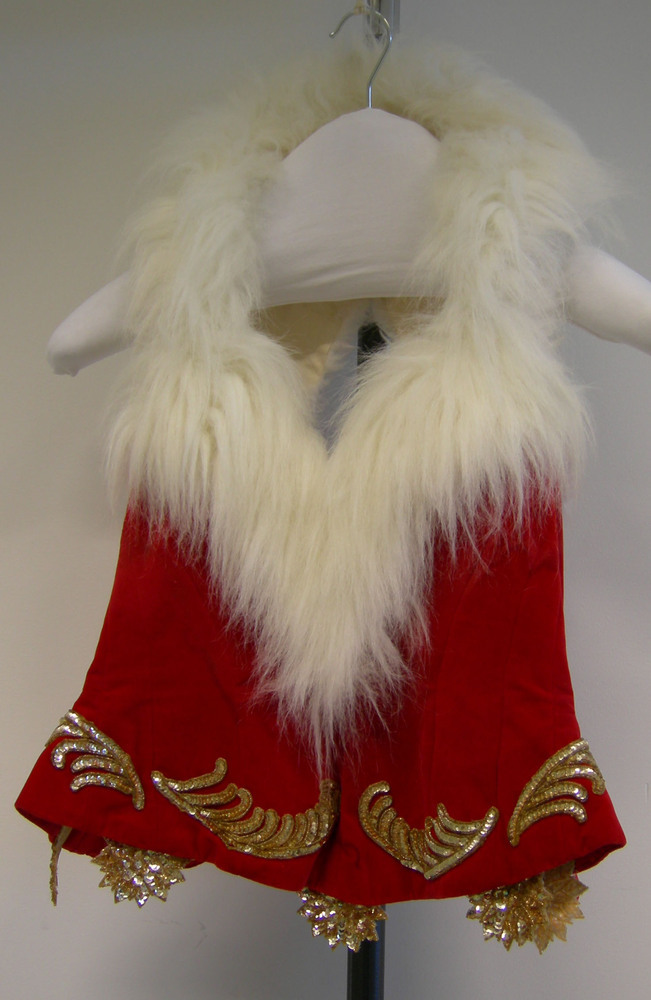 Onderdeel van outfit van Hellun Zelluf. Roodfluwelen top, hals afgezet met langharig wit kunstbont. Kunstbont aan binnenkant gevoerd met wit linnen. Onderkant afgezet met goudkleurige pailletten. Sluiting aan achterzijde met vijf haken en ogen. Gevoerd met rode voeringstof. Beide zijkanten aan binnenzijde verstevigd met baleinen.