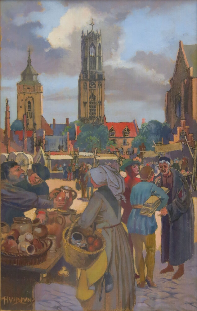 In 1937 gaf V&D een speciale kalender uit, ter gelegenheid van het vijftigjarig bestaan van de NV Amsterdamsche manufacturenhandel Vroom en Dreesmann. V&D was in 1887 te Amsterdam opgericht door de uit Veendam afkomstige Willem Vroom (1850-1925) en zijn zwager, de Duitse emigrant Anton Dreesmann (1854-1934). De kalender bestaat uit achttien platen, vervaardigd door kunstenaar Huib Luns, die samen op chronologische wijze de geschiedenis van de wereldhandel vertellen. De eerste plaat toont de tijd van jagers en verzamelaars, toen handel bestond in de vorm van ruil van levensbenodigdheden. De kalender eindigt met een plaat van een modern warenhuis van V&D, met deftige winkelaars en moderne leverancierswagens op de voorgrond. Op 31 december 2015 werd V&D failliet verklaard. ( Sarah Remmerts de Vries)