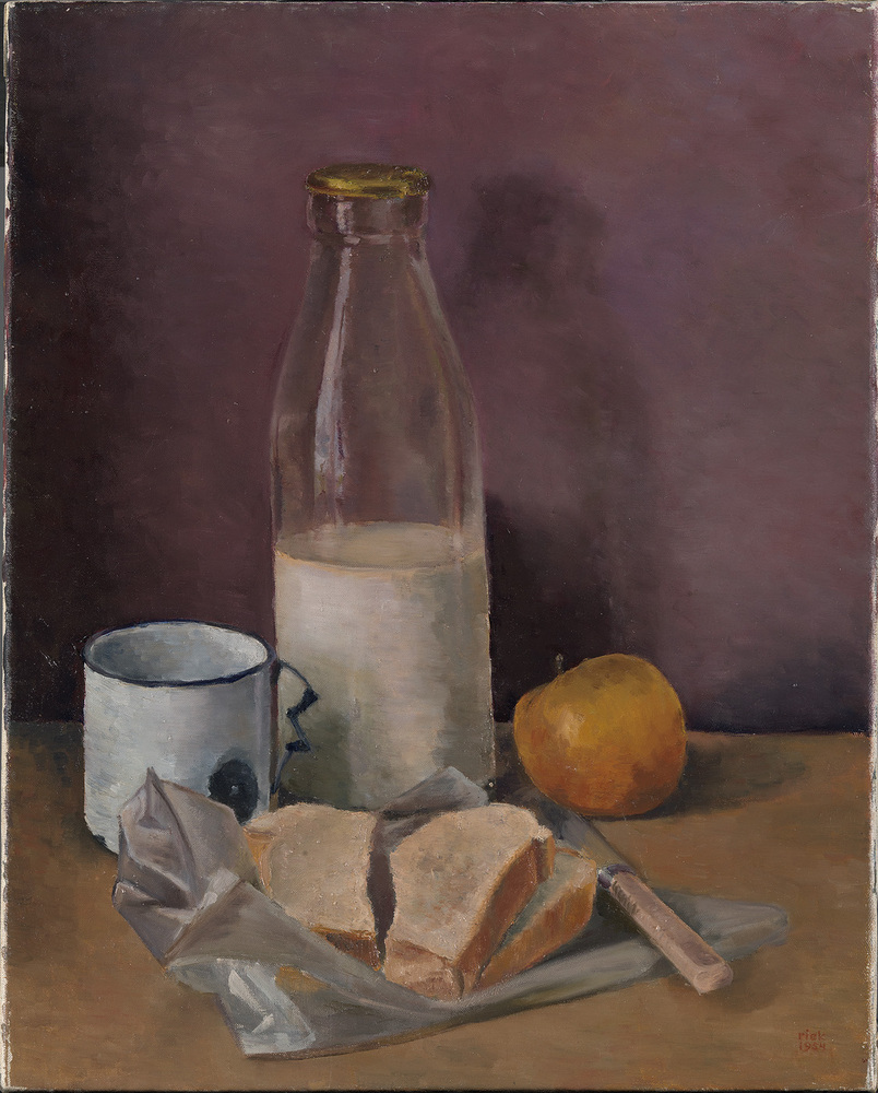 Een fles melk staat naast een wit-blauwe mok op tafel, erbij liggen een appel en twee boterhammen op een plastic boterhamzakje. Het mes ernaast wekt de indruk net gebruikt te zijn om de boterhammen te smeren of snijden. Het is lunchtijd, twaalf uur om precies te zijn, op 24 juni 1954 als Riek Milikowski-de Raat deze maaltijd in het voor haar typerende krachtige realisme vereeuwigd. Op dat moment is ze met haar tweede man, de socioloog Herman Milikowski, net verhuisd naar Leiden, waar Riek indringende portretten van de bewoners van volksbuurten tekent. Zou dit haar eigen lunch zijn of dat van één van haar modellen? ( Sarah Remmerts de Vries)