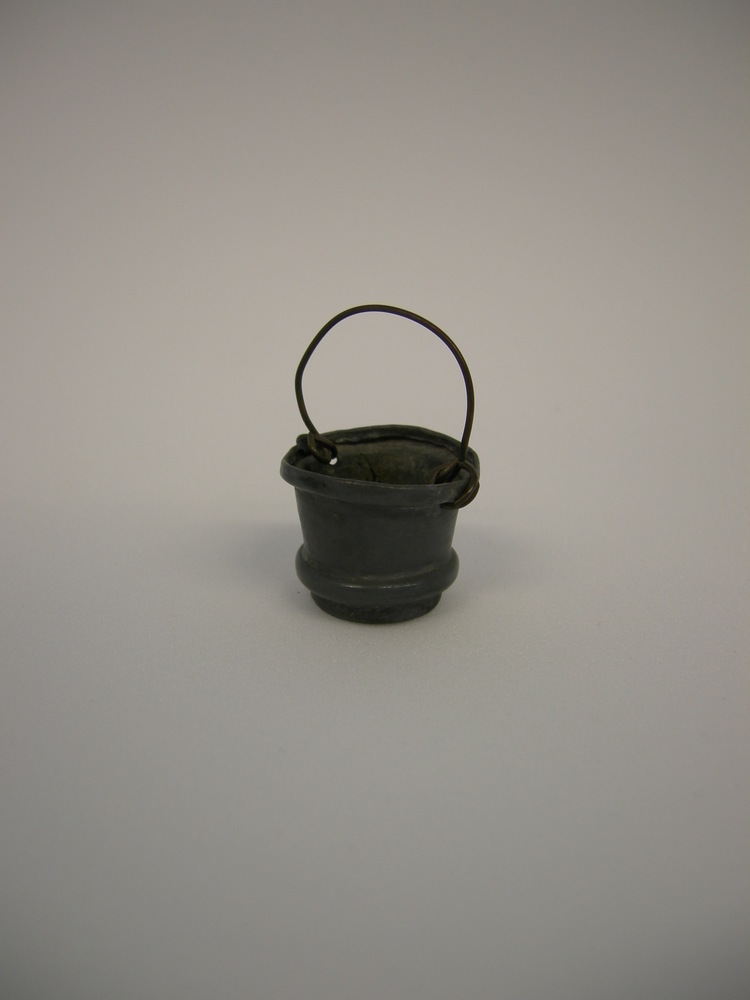 Kleine grijs metalen emmer met een hengsel van koperdraad. Er is een verdikking (rand) in het metaal van het emmertje in horizontale richting bij de voet en net onder de rand.