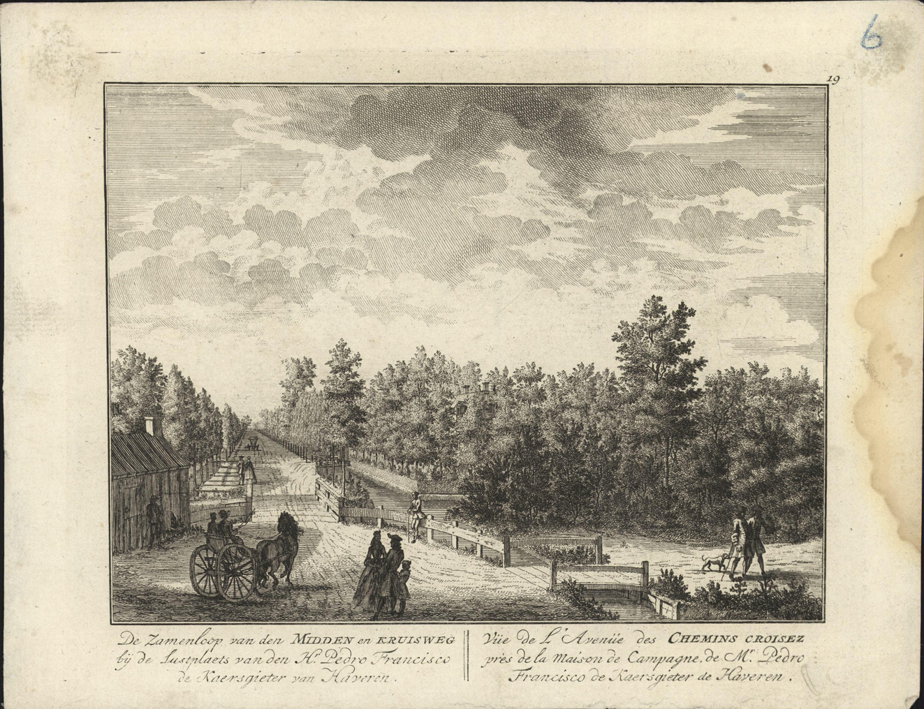 opschrift links onder in de marge: De Zamenloop van den Midden en Kruisweg/ bij de Lustplaets van den Hr. Pedro Francisco/ de Kaersgieter van Haveren.