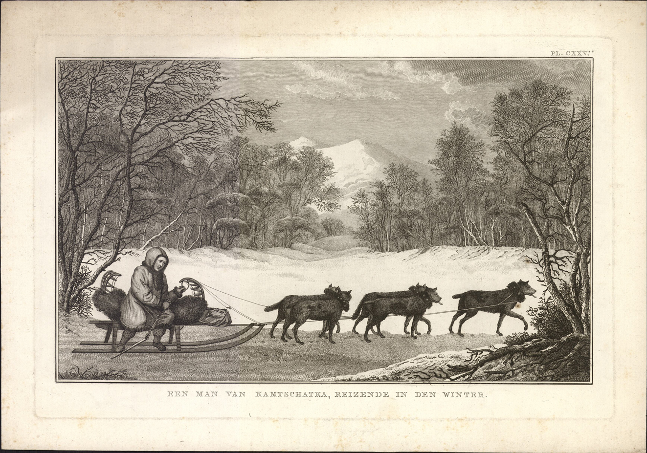 titel midden onder de afbeelding: Een man van Kamtschatka, reizende in den winter