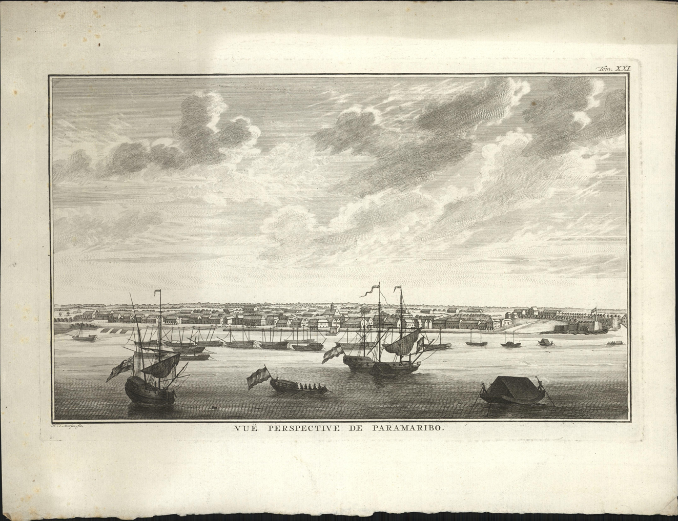 - titel midden onder de afbeelding: VUË PERSPECTIVE DE PARAMARIBO