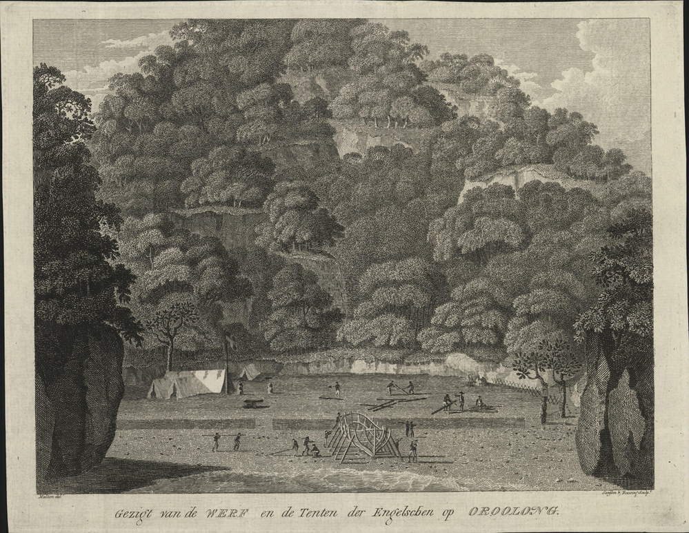 - opschrift midden onder afbeelding: Gezigt van de WERF en de Tenten der Engelschen op OROOLONG.