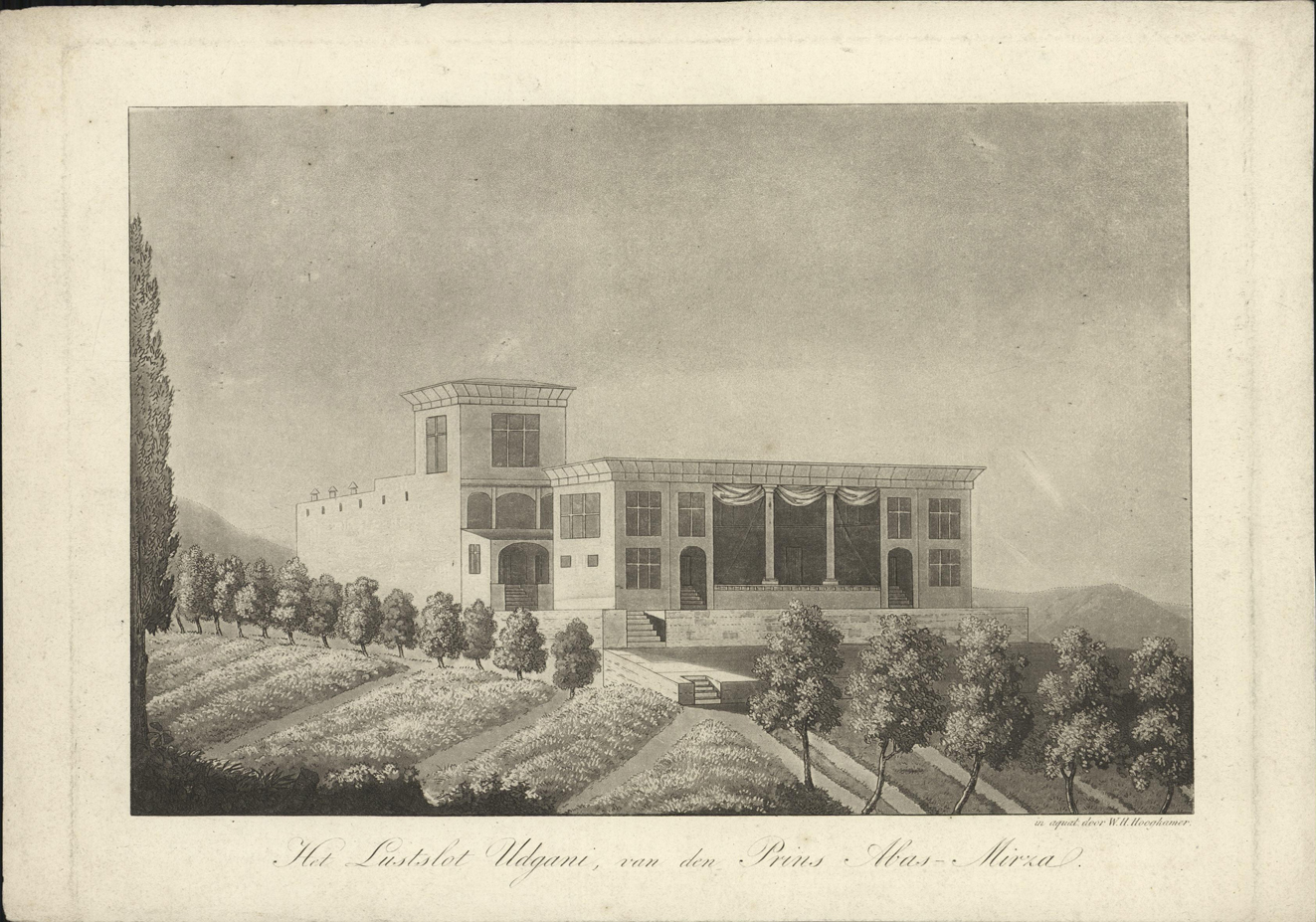 - opschrift onder de afbeelding: Het Lustslot Udgani, van den Prins Abas-Mirza