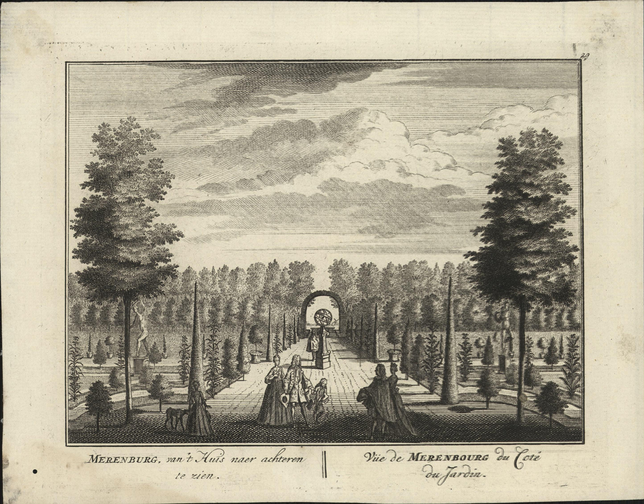 opschrift rechts onder in de marge: Vüe de MERENBOURG du Coté/ du Jardin.
