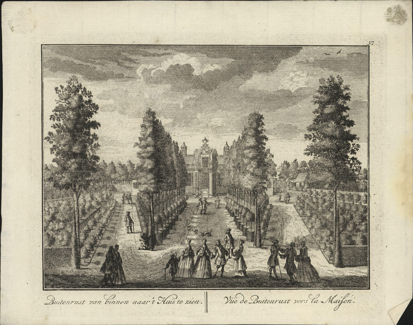 opschrift rechts onder in de marge: Vüe de Buitenrust vers la Maison.