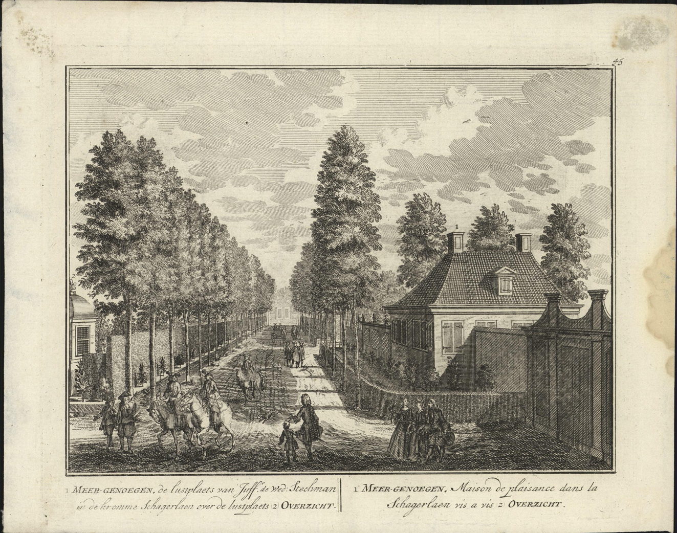 opschrift links onder in de marge: 1 MEER-GENOEGEN, de lustplaets van Juffr. de Wed: Stechman/ in de kromme Schagerlaen over de lustplaets (2) OVERZICHT.