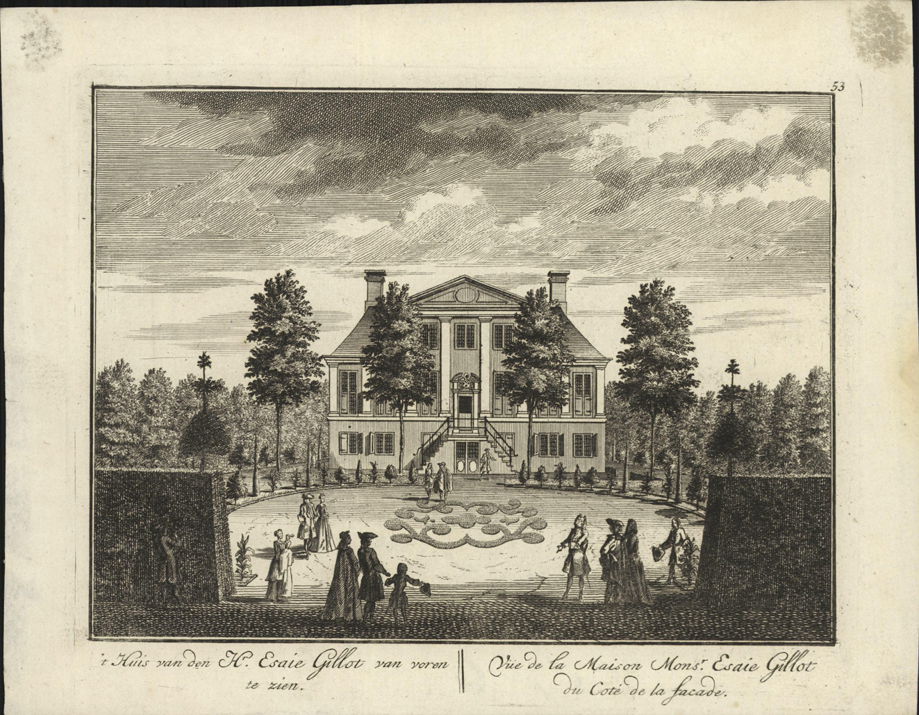 opschrift links onder in de marge: 't Huis van den Hr. Esaie Gillot van voren/ te zien.