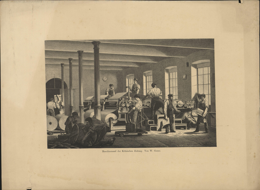 - opschrift midden onder afbeelding: Maschinensaal der Kölnischen Zeitung. Von W. Gause.