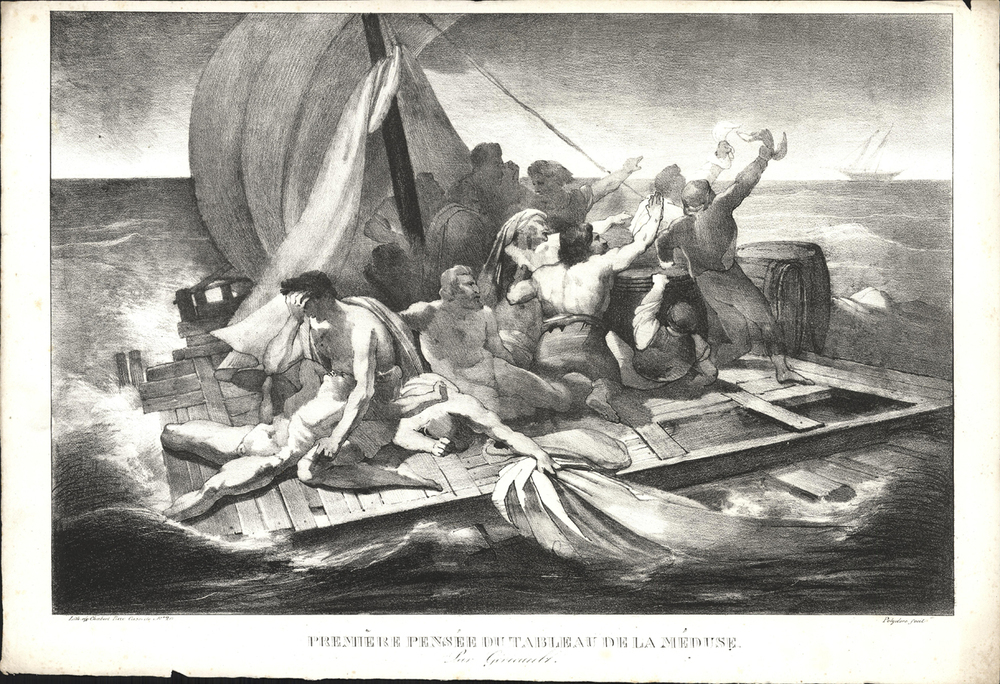 - opschrift midden onder afbeelding: PREMIERE PENSÉE DU TABLEAU DE LA MÉDUSE./ Par Gericault.