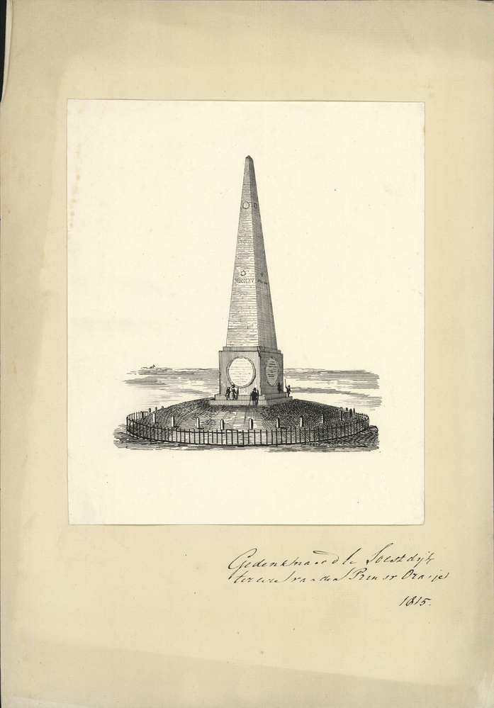 - opschrift rechts onder in marge: Gedenknaald te Soestdijk/ ter ere van den Prins v Oranje/ 1815.